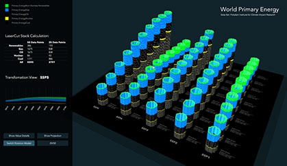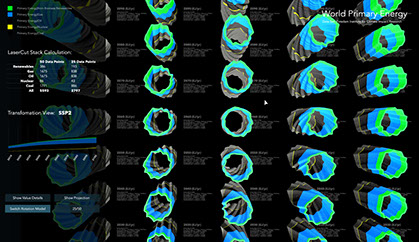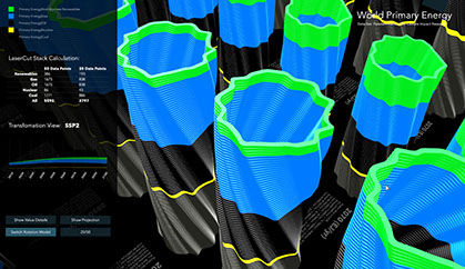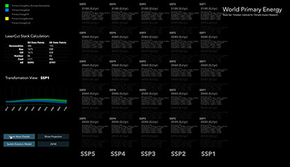 The app-controlled projection allows to highlight the pillars and compare several pathways during discussions or presentations. In order to stimulate deeper understanding, we included additional data parameters that contrast or support the energy data. Our prototype includes models for global warming and population growth. For each additional data layer, we developed a different visual metaphor to help differentiate the parameters.