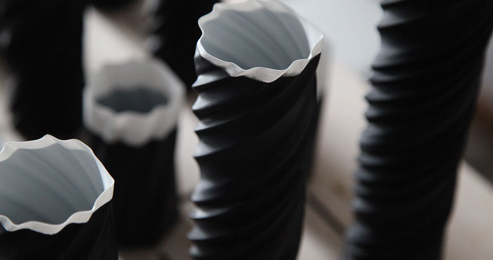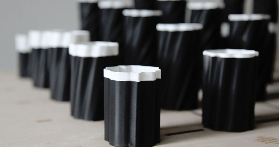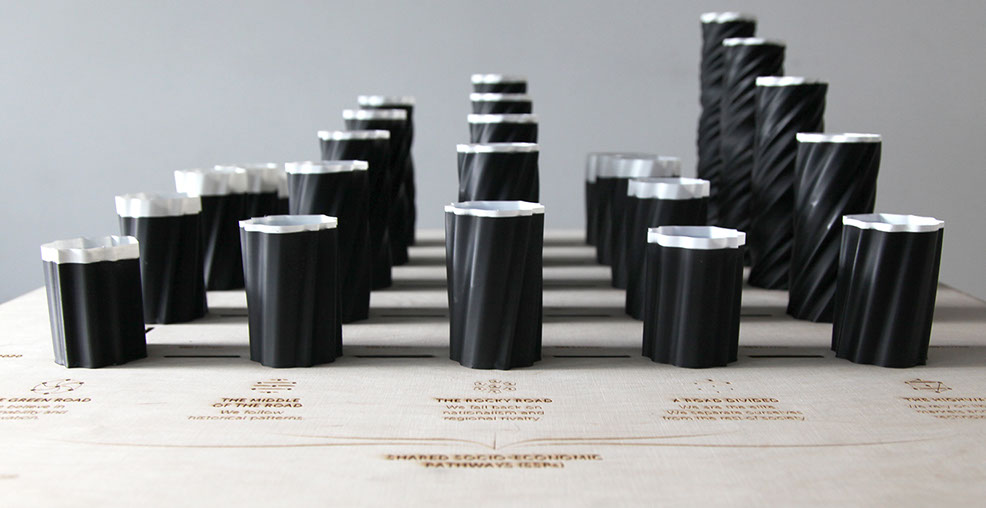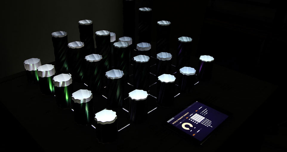 The object consists of 25 pillars printed in 3D. The height of each object represents the global consumption of primary energy per year (in Exajoules/year). Each object is divided in renewable energies (in white), and fossil fuels (in black). The twisting shows the distortion of energy developments in the future, compared to the start value.