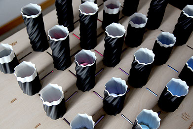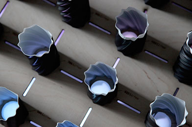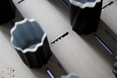 The final form models were generated in VVVV and Grasshopper. We used a 3D printer (FDM) to build the 25 energy pillows. The ground board was designed using a graphical editor and prepared for laser-cutting. The projector is placed underneath the board, in front of a mirror. The mirror reflects the light onto the board from below. The 25 pillars are placed on top of the board.